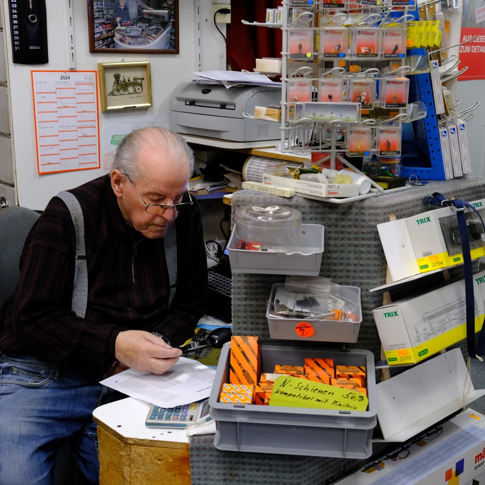 Alice HoferMan betritt den Laden und wähnt sich augenblicklich in einer früheren Epoche: Es riecht nach Vergangenheit, Abenteuerfantasien, Pioniergeist. In unzähligen Vitrinen und Regalen stapeln sich tausenderlei Modellfahrzeuge jeder Form und Farbe, plus Zubehör, künstliche Vegetationen und vielfältigste Figürchen. Es ist ein Paradies für Bastler und Tüftler. Und mittendrin stehen seit bald fünf Jahrzehnten fast täglich Marlen und Gottlieb Brunner. Seine erste Begegnung mit der Eisenbahn war 1941, als sein Onkel eine Uhrwerk-Loki ins Haus brachte, die jeweils nach zwei Minuten wieder aufgezogen werden musste. «So kam es schon mal vor, dass sie unter dem Sofa zum Stillstand kam», erzählt Brunner, von wo der 6-jährige «Godi» sie dann hervorkramte. Er war flink und hatte schon damals ein goldenes Händchen für Mechanik. «Als ein anderer Bub eine elektrische Modell-Eisenbahn geschenkt bekam, wurde ich gefragt, bei der Installation zu helfen; das konnte ich, ohne zu lernen, weil ich es einfach begriff». Und obwohl ihn die Fahrzeuge fesselten, hatte er nie den Bubentraum, Lokführer zu werden.