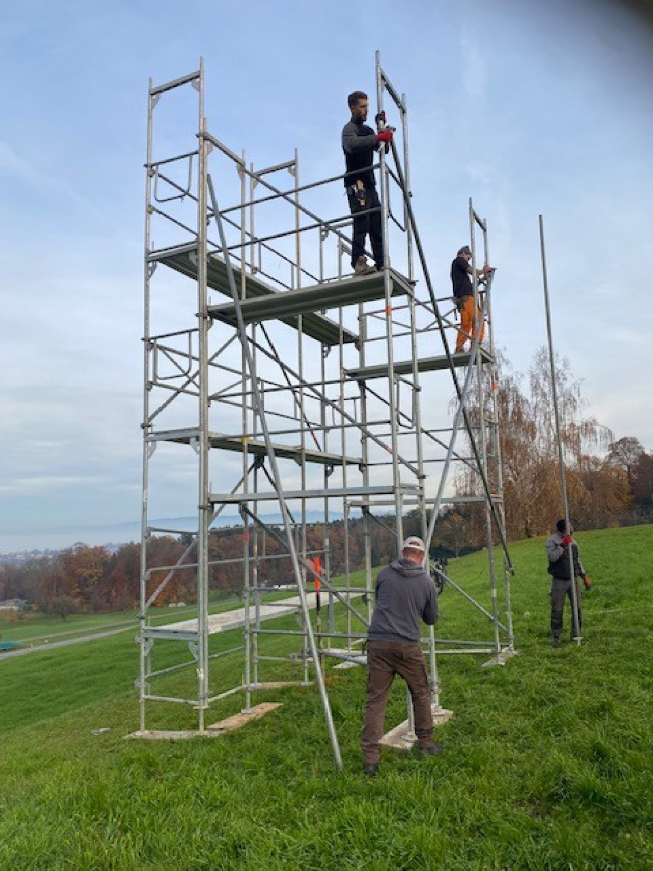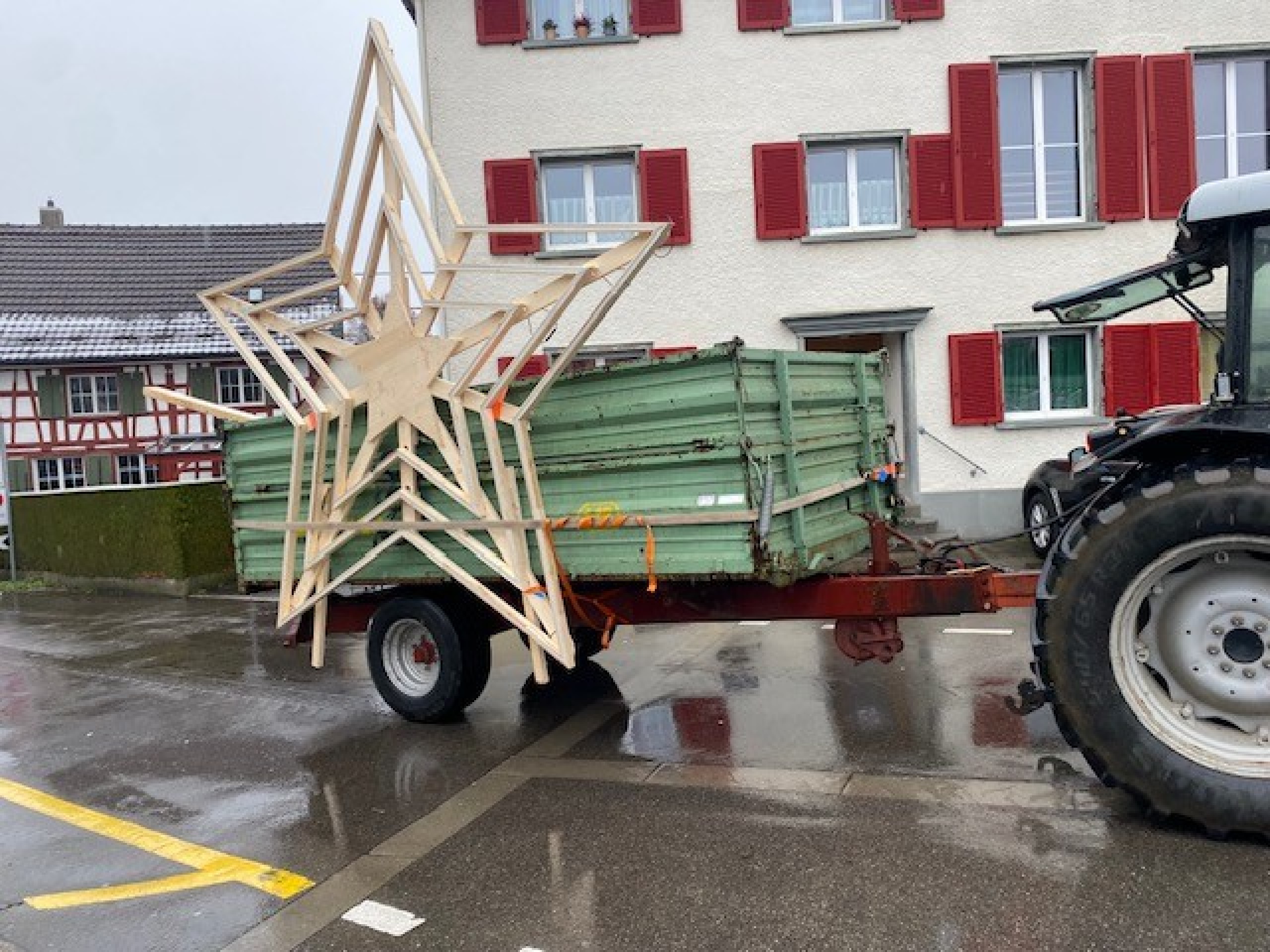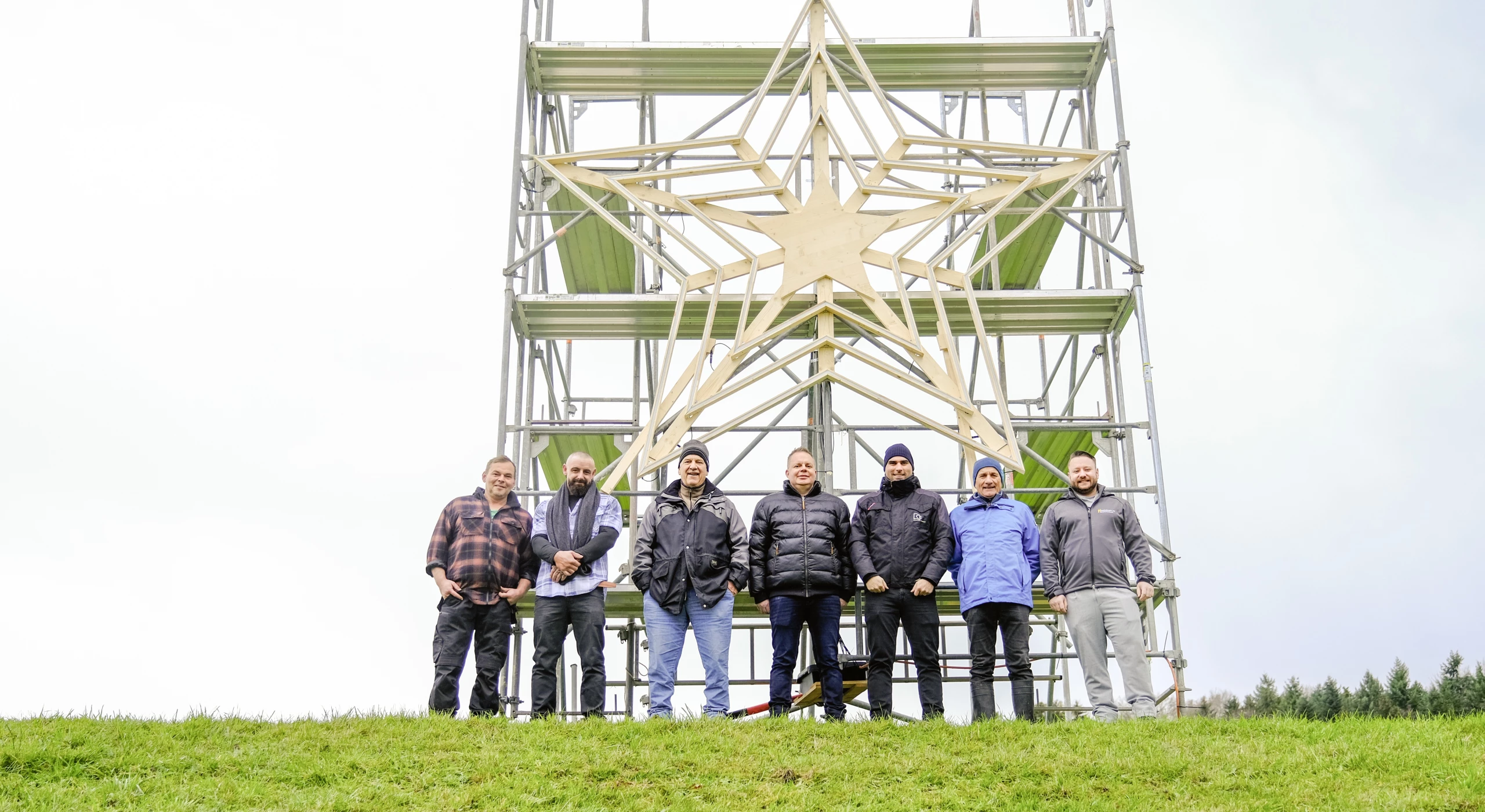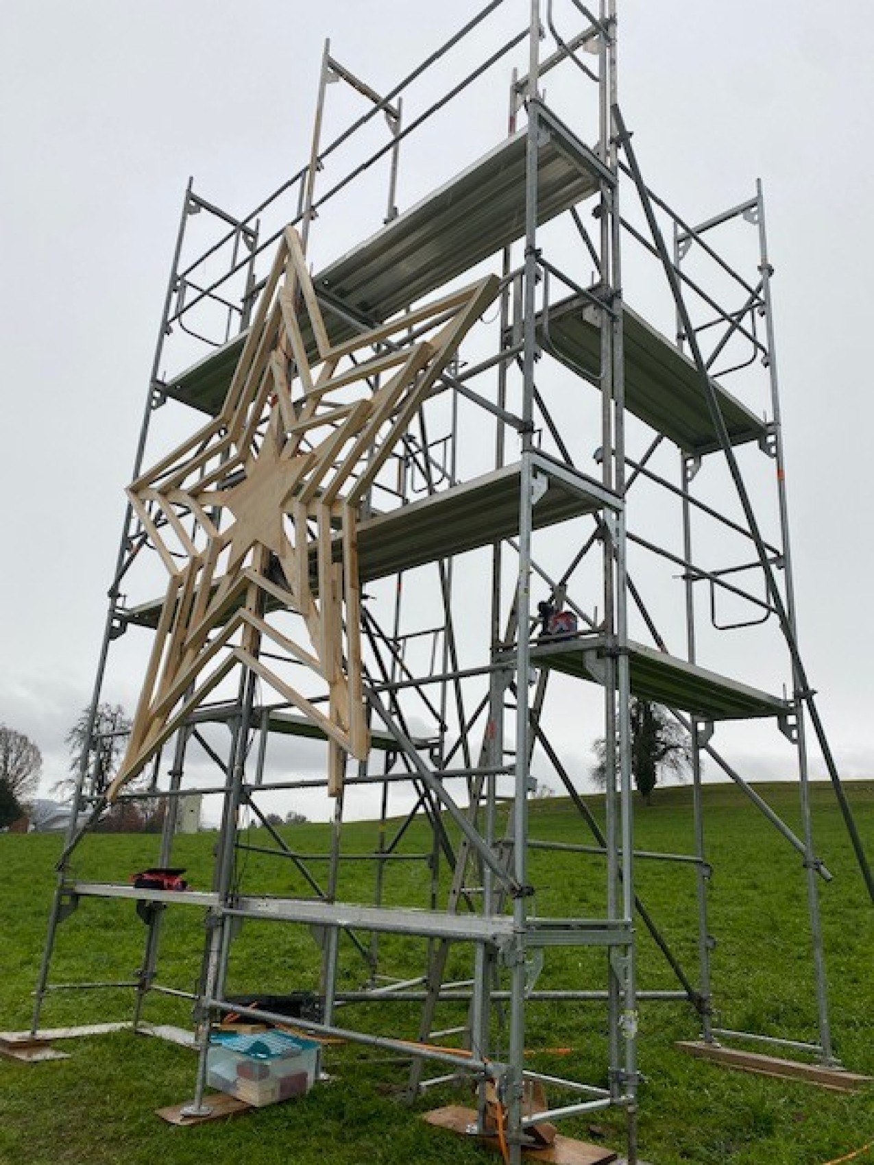 Gemeinsam machten sie sich an die Arbeit, den vier Meter grossen Holzbau zu fertigen und aufzustellen. Dieser besteht aus drei ineinander liegenden Sternen, die mit 32 Metern an LED-Lichtern bestückt wurden. Für die Stromzufuhr wurden 135 Meter Kabel verwendet. «Wir haben den Stern diese Woche zur Wiese transportiert und diesen am bereits aufgestellten und gesicherten Baugerüst angebracht. Am 1. Advent wird der Stern ab 17.30 Uhr in voller Pracht leuchten und positive Gedanken in die Welt senden. «Dass alle sofort bei diesem Projekt mitgewirkt haben, zeigt uns, dass das regionale Gewerbe an einem Strang zieht», stellt Ivan Fust freudig fest.