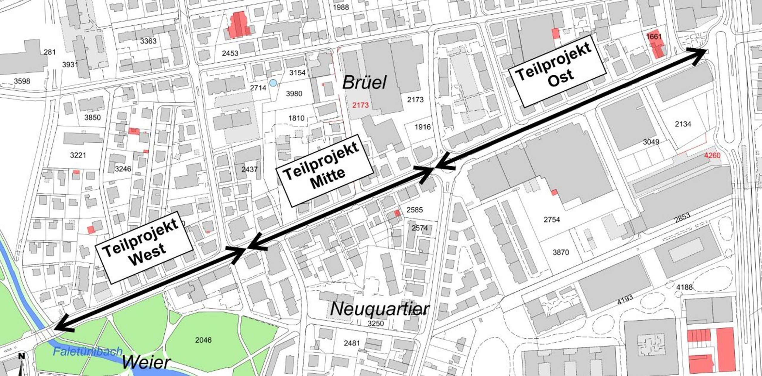 Die Aufwertung und Sanierung der St. Gallerstrasse wird in drei Teilprojekte unterteilt. Mit den Arbeiten wird voraussichtlich beim Teilprojekt West begonnen. Es folgenden Mitte und Ost. Die zentralen Ziele des Gesamtprojekts sind, den Strassenkörper funktional und technisch wieder auf den neusten Stand zu bringen, die Verkehrssicherheit für alle Verkehrsteilnehmenden zu verbessern und das Ortsbild aufzuwerten. Die wichtigsten Massnahmen, um diese Ziele zu erreichen, sind nachfolgend zusammengefasst. Die Arbeiten erfolgen jeweils abwechselnd auf einem Fahrstreifen.