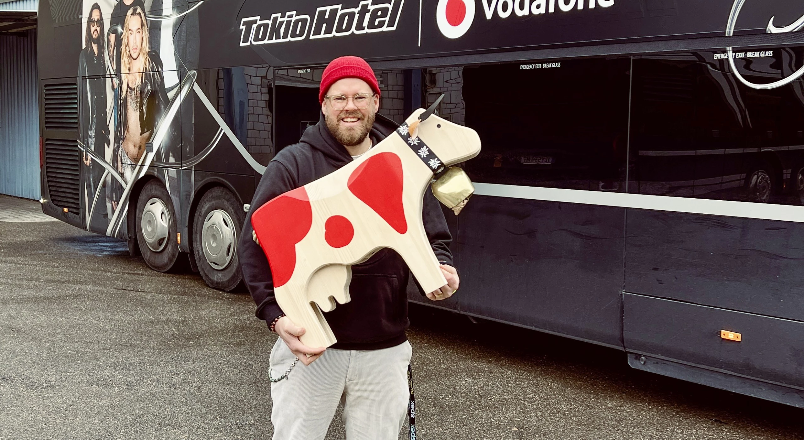 Kim Berenice GeserJeremy Kunz, im realen Leben im Marketing der Hotelkette b_smart tätig, hat ein ganz besonderes Hobby: Er betreibt Kuhhandel mit den Schlagzeugern der Stars. Wie das funktioniert? Ganz einfach: Vor jedem Konzert bastelt der Musikbegeisterte ein hemdsärmliges Schild. Darauf spricht er den Drummer oder die Drummerin der Band mit Namen an und schlägt einen Handel vor: Schweizer Holzkuh gegen Drummsticks. Damit ist die Sache geritzt. Kunz, der teilweise schon Stunden vor Konzertbeginn in der ersten Reihe vor der Bühne ausharrt, erhält die Schlaghölzer, die Musiker die kleine Holzkuh. So kam im Laufe der Jahre eine stattliche Sammlung an Drumsticks zusammen, darunter auch jene der Schlagzeuger von Taylor Swift und der Band Coldplay. «Die Drummer sind jedesmal begeistert von der Idee», erzählt Kunz und weiss auch wieso: «Auf den Plakaten im Publikum stehen meist nur die Namen der Leadsängerinnen und -sänger, kaum je die der Schlagzeuger.» Diese ungewohnte Geste der Aufmerksamkeit bleibt deshalb nie ungesehen. Auch nicht von «Tokio Hotel»-Schlagzeuger Gustav, der am letzten «SummerDays» auf Kunz’s Plakat aufmerksam wurde und diesem seine Sticks überliess. Gustavs Kuh blieb allerdings auf der Strecke, weil dieser zu schnell von der Bühne verschwand. Doch das wundersame Wirken der Sozialen Medien brachte die beiden im virtuellen Raum wieder zusammen und ein neuer Deal wurde ausgehandelt: grössere Holzkuh für Geschenk mit Widmung. Eine Steilvorlage für Kunz, der umgehend ein XXL-Modell der Trauffer-Kuh organisierte. Diese reiste vergangenen Sonntag sehnlichst erwartet mit vier kleinen Geschwistern für die übrigen Band-Mitglieder und Gustavs Tochter mit ans «Tokio Hotel»-Konzert in Zürich und dekorierte dort noch vor dem ersten Song den Backstage-Bereich. Und Kunz? Der erhielt nach Ende des Konzerts wie versprochen sein Geschenk: ein signiertes Schlagzeugfell und ein Selfie mit der Band für seine ganz persönliche Wall of Fame.