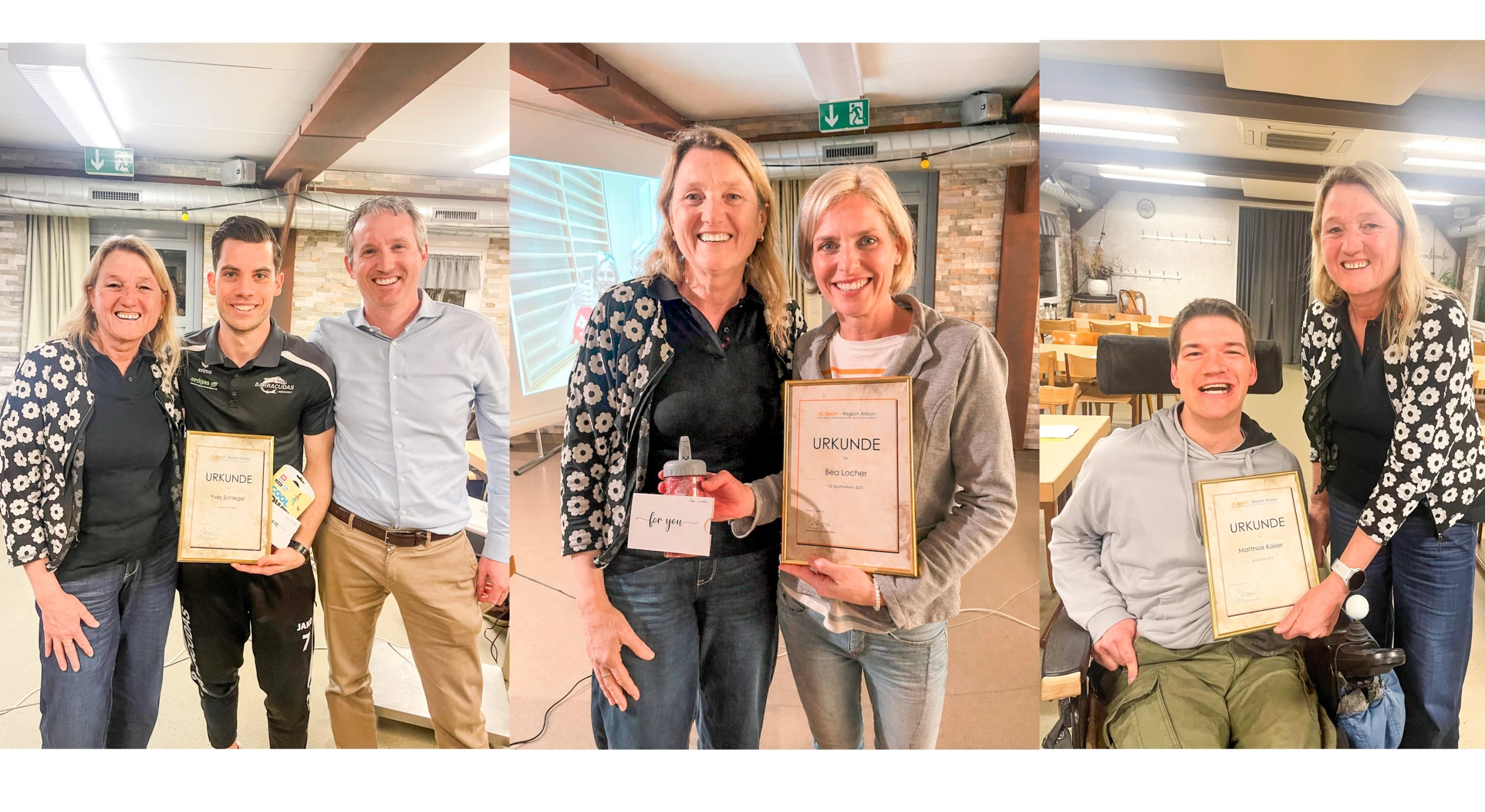 Im Zentrum des Abends standen die Ehrungen verdienter Sportpersönlichkeiten. Als Sportförderin 2025 wurde Bea Locher vom Handballclub Arbon ausgezeichnet. «Mit ihrem langjährigen und engagierten Einsatz leistet sie einen wichtigen Beitrag zur Förderung des Handballsports und des Vereinslebens in der Region Arbon», schreibt die IG in einer Medienmitteilung. Den Titel Sportler 2025 vergab die Jury gleich an zwei Persönlichkeiten: Matthias Kaiser (Sailability) und Yves Schlegel (Barracudas Unihockey Oberthurgau). Kaiser überzeugte mit herausragenden Erfolgen im inklusiven Segelsport. Er erzielte 2025 mehrere Spitzenplatzierungen bei nationalen und internationalen Regatten und engagiert sich für die Weiterentwicklung des inklusiven Segelns. Yves Schlegel (siehe Bild Oben links) wurde für seine langjährige und vielseitige Unihockey-Karriere geehrt. Neben seinen sportlichen Leistungen prägte er den Sport auch als Trainer und Funktionär nachhaltig.