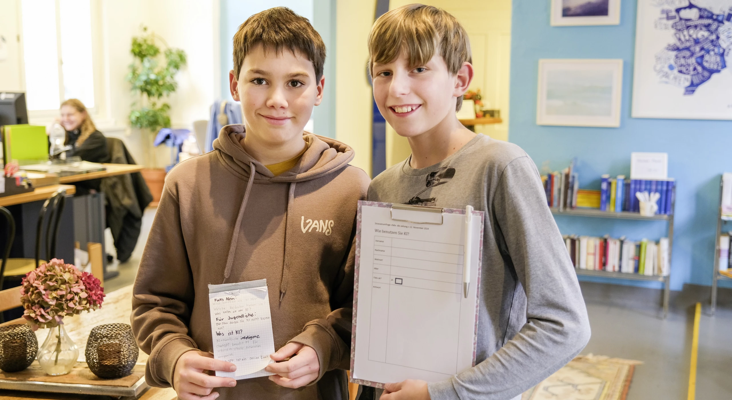 Denn während KI künftig beispielsweise in der Medizin Frühdiagnosen ermöglichen könnte, kann sie auch zu schädlichen Zwecken wie manipulierten Informationen, Überwachung oder Hacking-Angriffen eingesetzt werden. Diese Ambivalenz und das oft noch fehlende Wissen führt zu Verunsicherungen im Umgang mit KI – auch bei den beiden Nachwuchsreporter Casimir Cools und Lukas Curschellas. Die beiden Sechstklässler verbrachten letzte Woche den Zukunftstag auf der «felix.»-Redaktion und fühlten in einer Strassenumfrage den Puls der Bevölkerung in Sachen KI. Sie selbst könnten in ihrer KI-Nutzung nicht unterschiedlicher sein: Lukas ist die Technologie zu wenig menschlich, weshalb er nicht mit KI arbeitet. Beziehungsweise nur bedingt, denn wie Casimir nutzt auch er Suchmaschinen wie Google, die sich auch auf KI stützen. Casimir verwendet zudem privat KI-Progamme wie «Perplexity», um Bücher zusammenzufassen oder Fragen, zum Beispiel zur artgerechten Hühnerhaltung zu stellen. Dabei gilt für ihn der Grundsatz: «Glaub nicht alles, was KI dir sagt. Frag dich im Zweifelsfall immer: Kann das wirklich sein?»